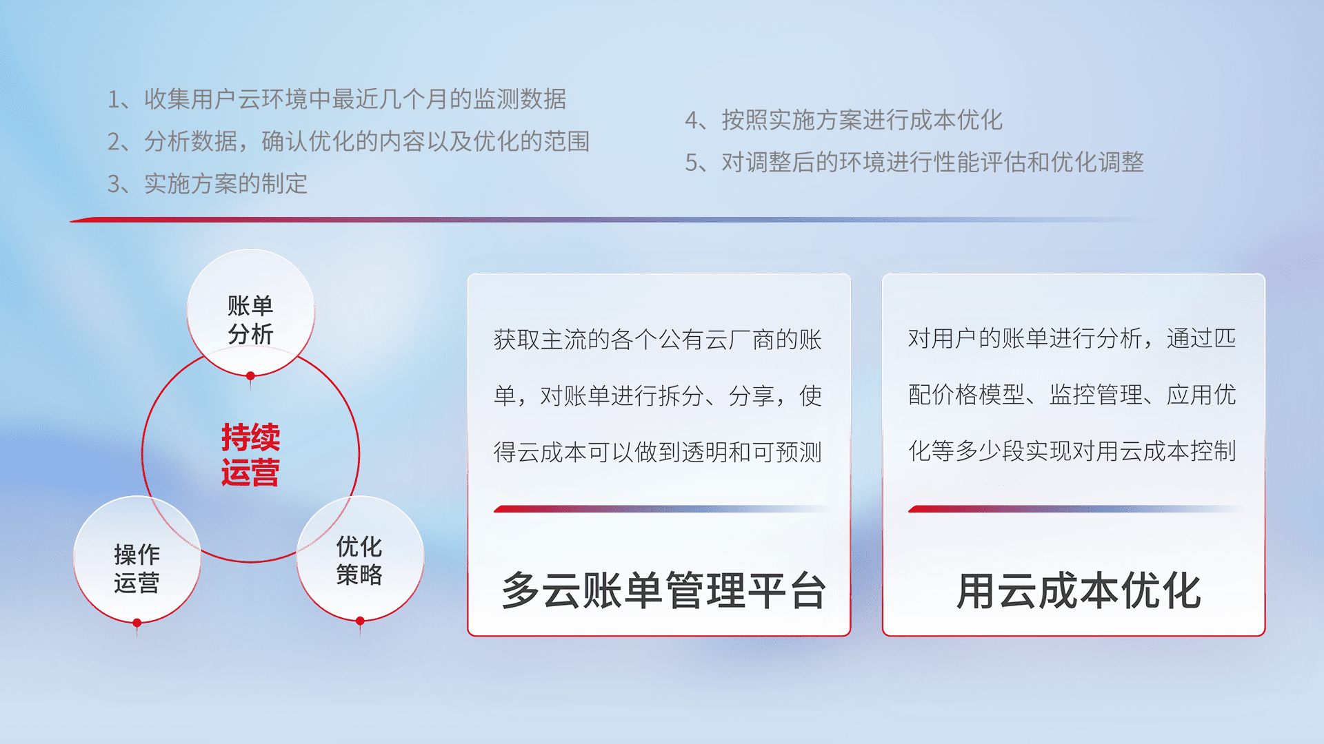 通过多云纳管,,以统一的资源数据模型把客户的云资源进行抽象和封装,,进而实现对多云资源的统一操作,,,保障云资源管理的可靠性、、、稳定性与可用性。。。。量身定制化运维内容,,,配置、、、开发运维、、、补丁管理、、、、备份、、、监控、、、、认证和访问管理、、、审计和日常巡检等,,,保障在用云过程中的可靠度,,,,稳定度以及高可用率。。。